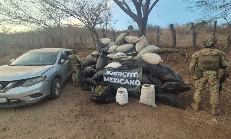 Durante las labores de reconocimiento, el personal federal localizó 40 costales con hierba verde y seca con características similares a la marihuana, con un peso aproximado de mil 75 kilogramos, así como 23 kilogramos de semilla del mismo enervante.
