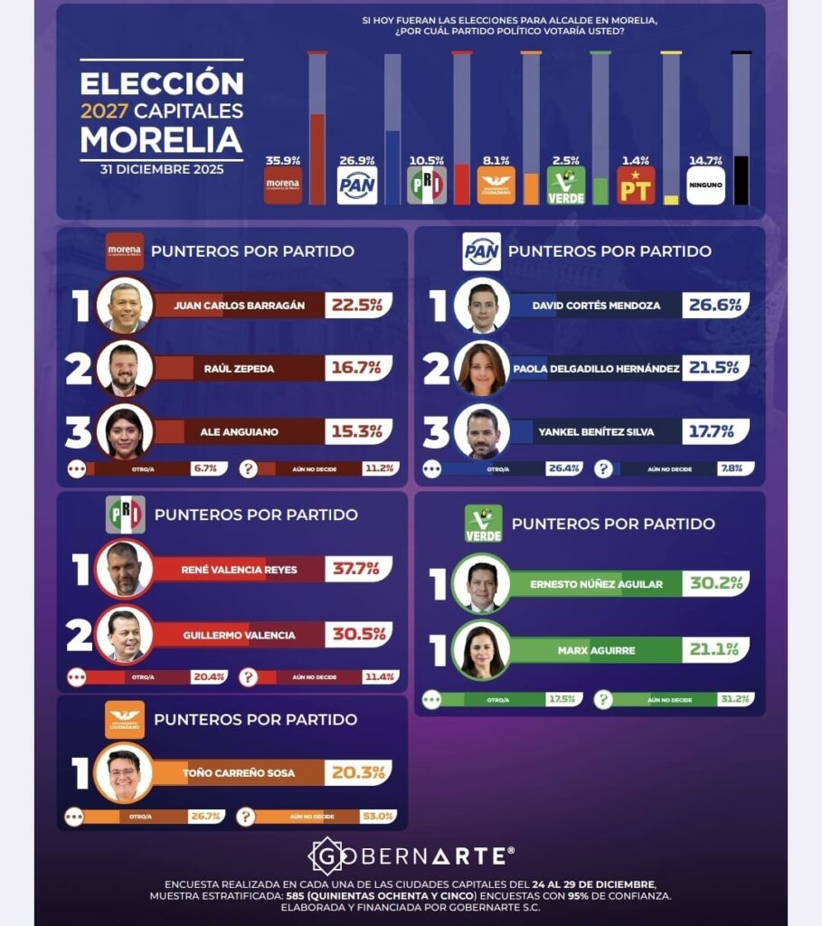 Se realizaron 585 encuestas en el periodo del 24 al 28 de diciembre del 2025, donde se preguntó a los ciudadanía de manera aleatoria, ¿Si hoy fueran las elecciones para alcalde en Morelia, por cuál partido político votaría usted?.