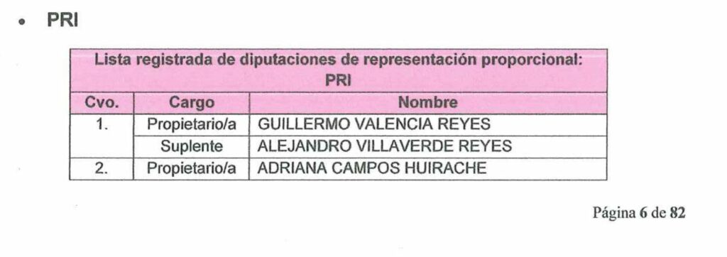 Así, en el acuerdo que emitió el Instituto Electoral de Michoacán para la Coalición PRI- PAN- PRD del 2024 su nombre aparece en la lista plurinominales del PRI como suplente de Guillermo Valencia.