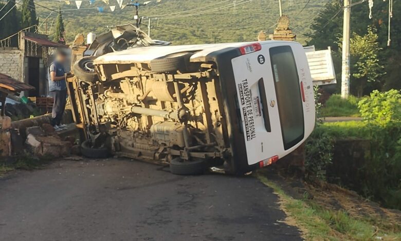 Choca vehículo de transporte de personal contra objeto fijo y vuelca, en Tacícuaro