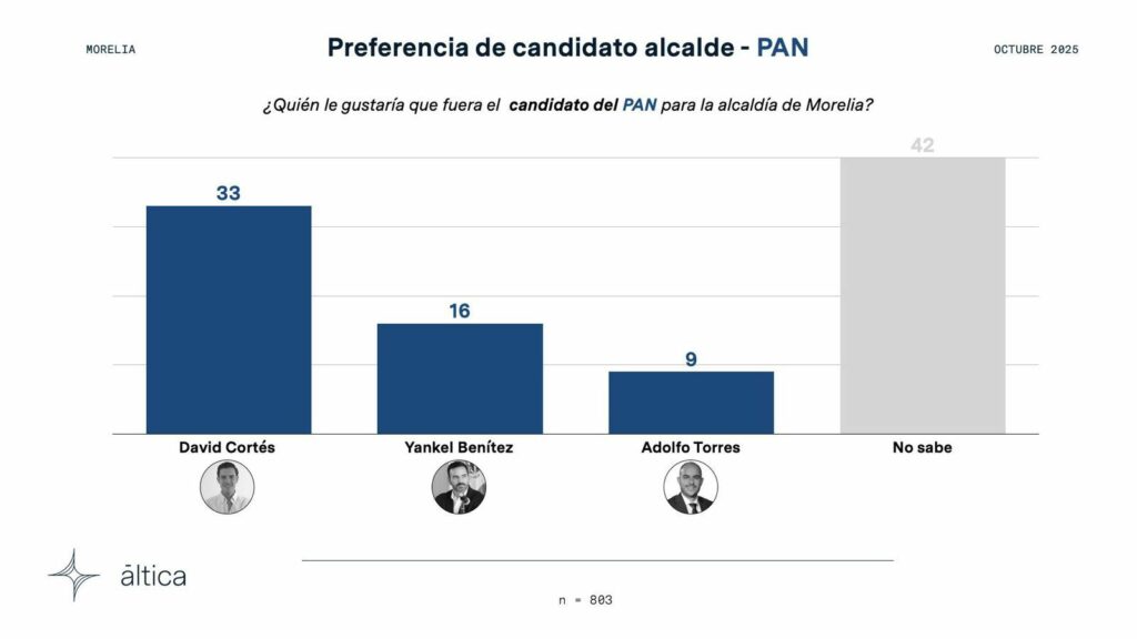Morelia, Michoacán, a 21 de octubre del 2025.- Hoy la casa encuestadora Áltica hizo público sus resultados de Intención de Candidatos para Morelia Rumbo a los 2027 y ahí, el mejor posicionado del PAN resultó el diputado Federal por el Distrito 10 Morelia, David Cortés.