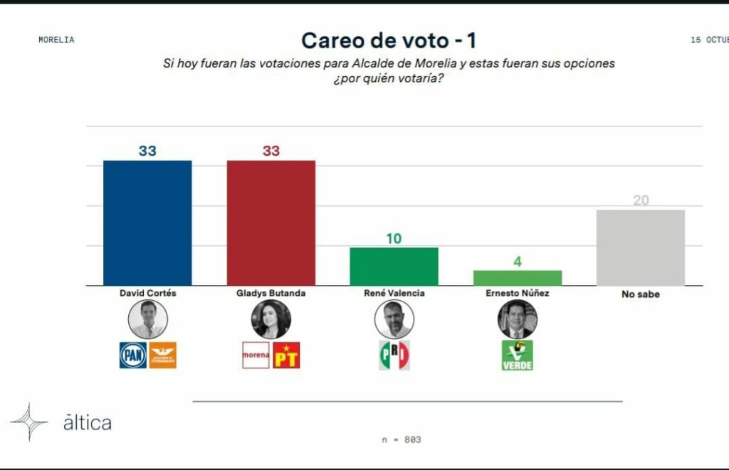 Cabe señalar que los datos metodológicos son que la encuesta se levantó el 17 y el 18 de octubre, mediante 803 llamadas telefónicas en Morelia, con un margen de erros del 3.46 más o menos puntos porcentuales.