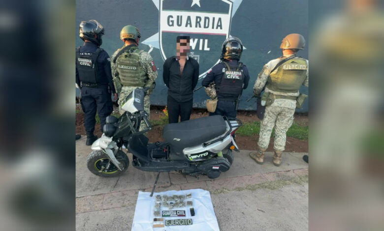 Al patrullar sobre una brecha de terracería en la colonia Villas del Oriente, elementos de la Guardia Civil y del Ejército Mexicano localizaron al ahora detenido de 26 años a bordo de una motocicleta, a quien le marcaron el alto para efectuarle una inspección.