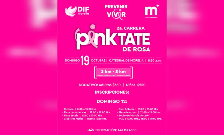 Morelia, Michoacán; a 10 de octubre de 2025.– La Presidenta Honoraria del DIF Morelia, Paola Delgadillo Hernández, invita a la ciudadanía a inscribirse a la 2ª Carrera Atlética “Pinktate de Rosa”, que se llevará a cabo el domingo 19 de octubre, con salida en Catedral de Morelia y recorridos de 3 y 5 kilómetros.