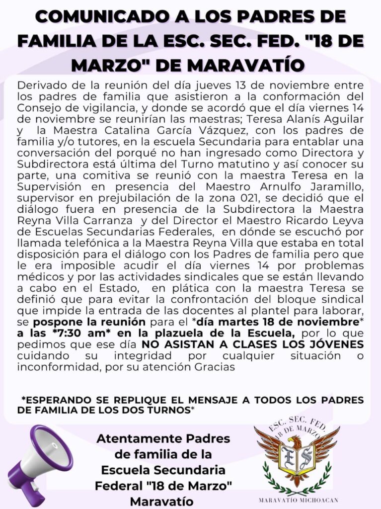 Por todo lo anterior los padres de familia exigen que las autoridades a nivel estatal tomen cartas en el asunto, exigiendo que el Director Ricardo Leyva y la subdirectora Reyna Villa Carranza quienes están encargados de la Dirección de Escuelas Secundarias en el Estado, velen por los intereses de los alumnos y no por los de una fracción sindical y hagan valer los nombramientos de las docentes que están ya en cargo y las instalen en la Escuela Secundaria Federal “18 de Marzo”, haciendo un llamado a la Secretaria de Educación en el Estado, Dra. Gabriela Molina y al Gobernador del Estado Lic. Alfredo Ramírez Bedolla a NO dejarse intimidar por el sindicalismo y apoyar la educación en el Estado.