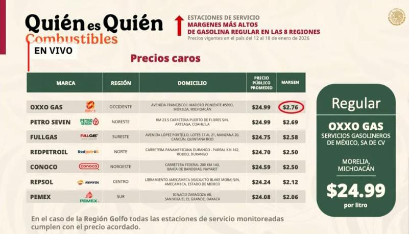 Morelia, Michoacán, a 26 de enero del 2026.- En Morelia está la gasolinera más cara de México, según las mediciones nacionales que presenta cada semana la Procuraduría Federal del Consumidos en las conferencias mañaneras de la presidenta Claudia Sheinbaum Pardo.