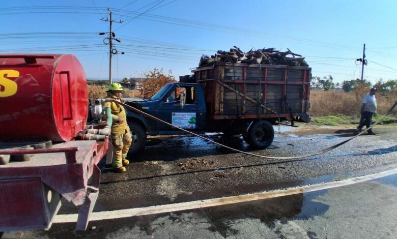 El incidente ocurrió sobre la carretera Cuatro Caminos-Apatzingán, a pocos metros del puente que conduce al fraccionamiento Girasoles. En ese punto, una camioneta Ford de doble rodado, color azul con rojo y con placas GX-1070-C, que transportaba madera, comenzó a desprender una densa columna de humo proveniente de la carga.