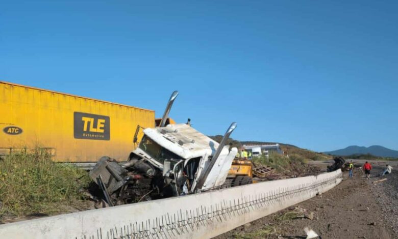 Al lugar se trasladaron paramédicos de Ambulancias AMBUMED, quienes a su llegada encontraron el tractocamión con una cabina de color blanco y remolque con la enorme barra de concreto en un desnivel por fuera de la carpeta asfáltica.