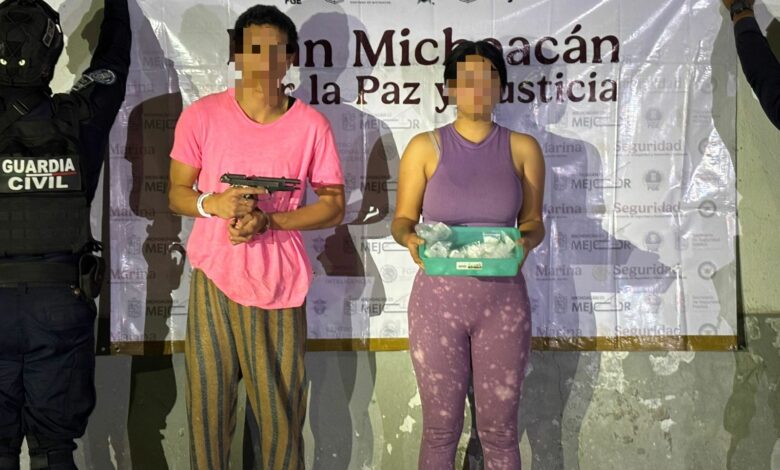 Uruapan, Mich.- 15 de enero de 2026.- Un hombre y una mujer que tenían en su poder varios gramos de droga sintética de la conocida como “crystal” listos para su venta y una pistola fueron detenidos la noche del pasado miércoles por elementos del Grupo Motorizado de la Guardia Civil.