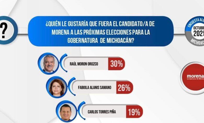 Morelia, Michoacán, a 31 de octubre de 2025.- La nueva encuesta de Algoritmo muestra una contienda cada vez más cerrada al interior de Morena rumbo a la gubernatura de Michoacán. Raúl Morón Orozco conserva el primer lugar con 30% de apoyo, pero su ventaja se reduce considerablemente frente a Fabiola Alanís, quien ya registra 26% de preferencias y consolida un crecimiento que se mantiene constante desde inicios de año.