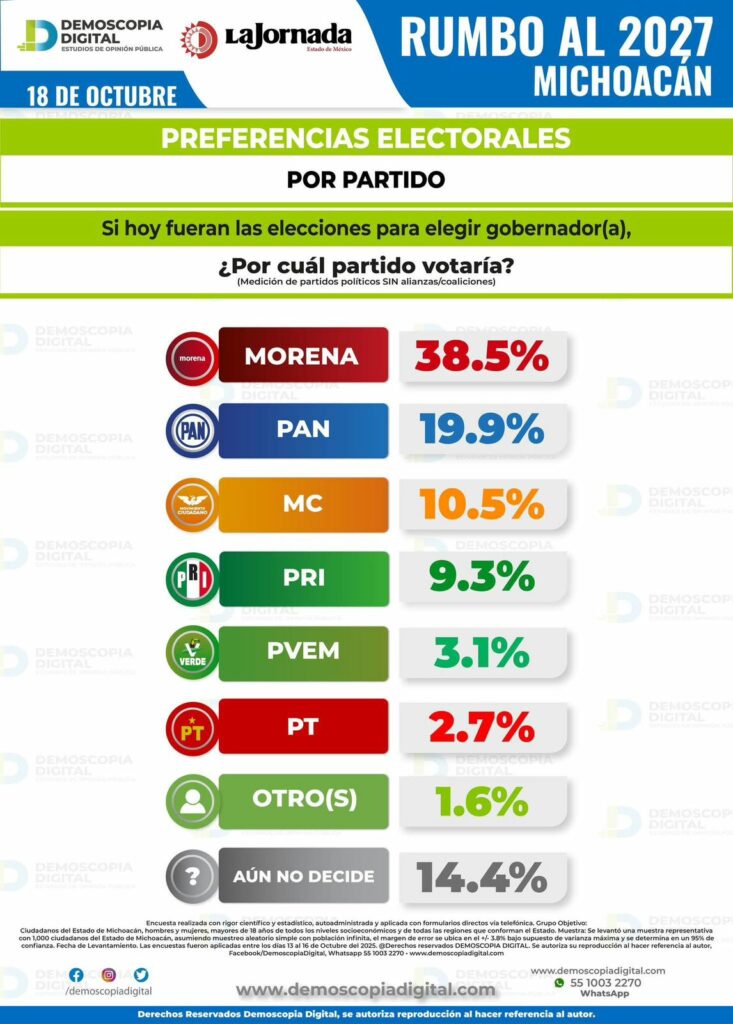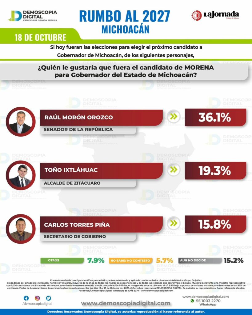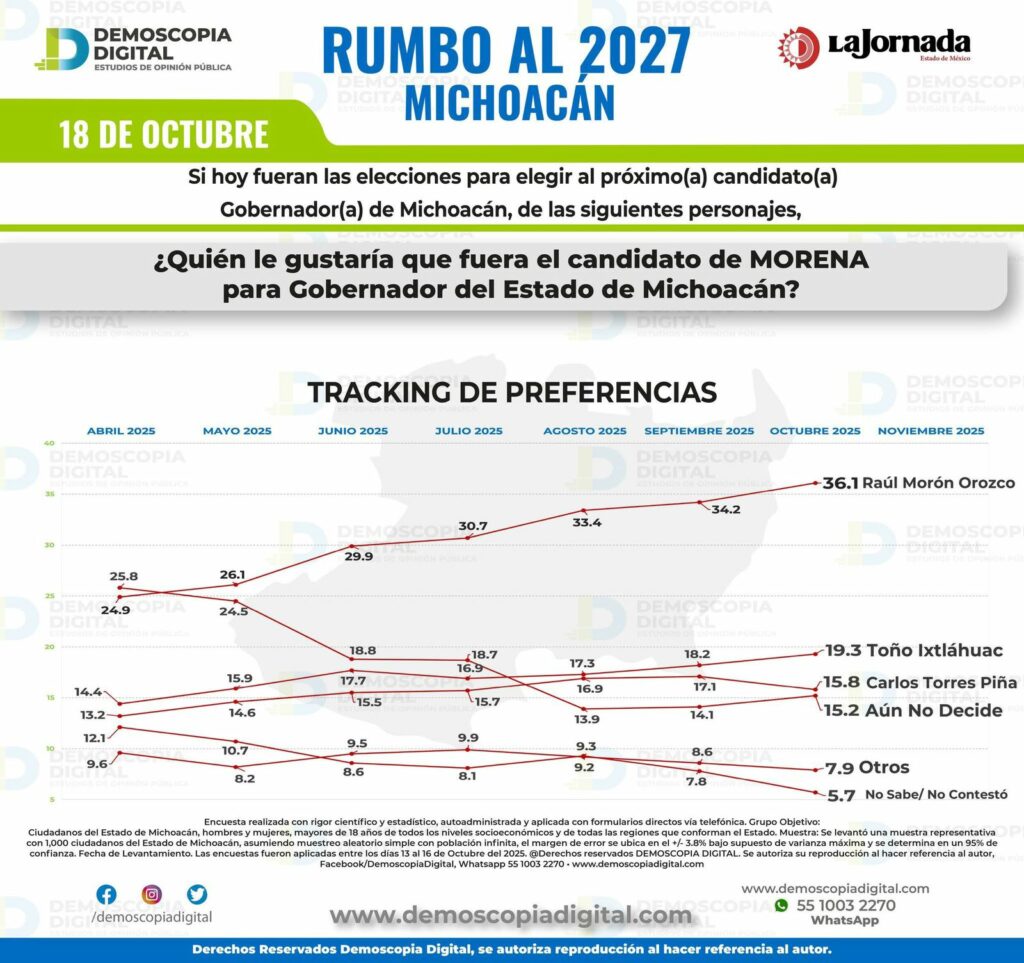 Morelia, Mich., a 20 de octubre de 2025.- Raúl Morón Orozco será el próximo gobernador de Michoacán, esto de acuerdo a Demoscopia Digital, que de acuerdo a su ejercicio publicado en La Jornada, coloca al actual senador con un 36.1% de las preferencias, que junto al 38.5% de la intención de voto por Morena, hacen ver una victoria contundente en el proceso electoral del 2027.