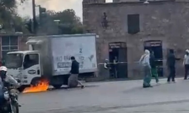 Normalistas le prenden fuego a camión repartidor a la altura de Las Tarascas, Morelia