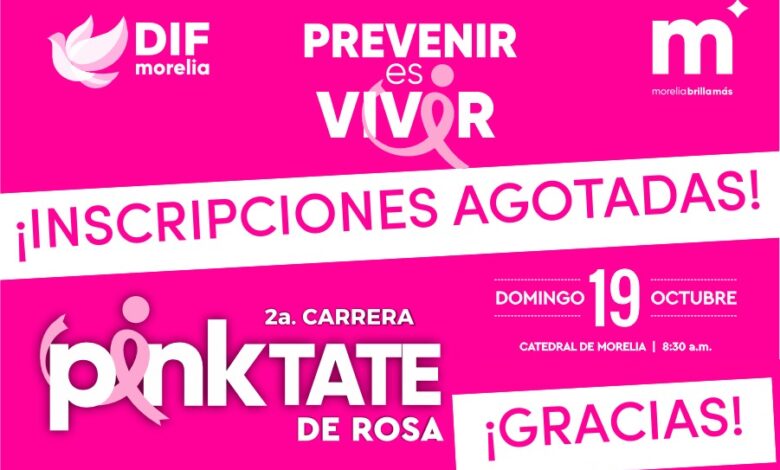 Morelia, Michoacán; 17 de octubre de 2025.– La presidenta honoraria del DIF Morelia, Paola Delgadillo Hernández, anunció que las inscripciones para la Segunda Carrera Atlética “Pinktate de Rosa” han quedado agotadas, gracias a la entusiasta respuesta de la ciudadanía que se ha sumado a esta causa solidaria en apoyo a mujeres que han superado o enfrentan el cáncer de mama.