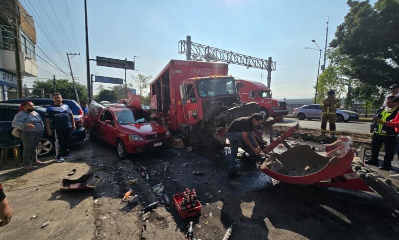 Morelia, Mich.- Miércoles 24 de diciembre de 2025.- Un camión de la empresa Coca-Cola chocó contra un poste metálico en el Periférico Paseo de la República, al norponiente de Morelia. Debido al impacto, parte de su cargamento se salió tras el movimiento brusco, cayó sobre una camioneta y, a su vez, la empujó contra otro vehículo que se encontraba estacionado a la orilla del camino, informaron autoridades policiales.