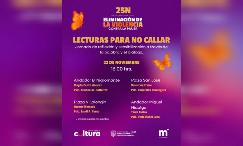Morelia, Michoacán; 19 de noviembre de 2025.– La Secretaría de Cultura de Morelia (SeCultura) invita a la ciudadanía a participar en las “Lecturas para no callar”, una jornada simultánea de reflexión y sensibilización a través de la palabra y el diálogo en el marco del 25 de noviembre (25N), Día Internacional de la Eliminación de la Violencia contra la Mujer.