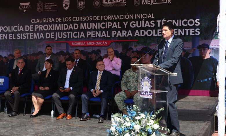 Morelia, Michoacán; 31 de octubre de 2025.–El Presidente Municipal, Alfonso Martínez Alcázar, participó en la ceremonia de clausura de los cursos de formación inicial para policía de proximidad municipal y guías técnicos en el sistema de justicia penal para adolescentes. El evento se realizó en el Instituto Estatal de Estudios Superiores en Seguridad y Profesionalización Policial de Michoacán, donde se graduaron 260 elementos, de los cuales 81 pertenecen a la Policía de Morelia.