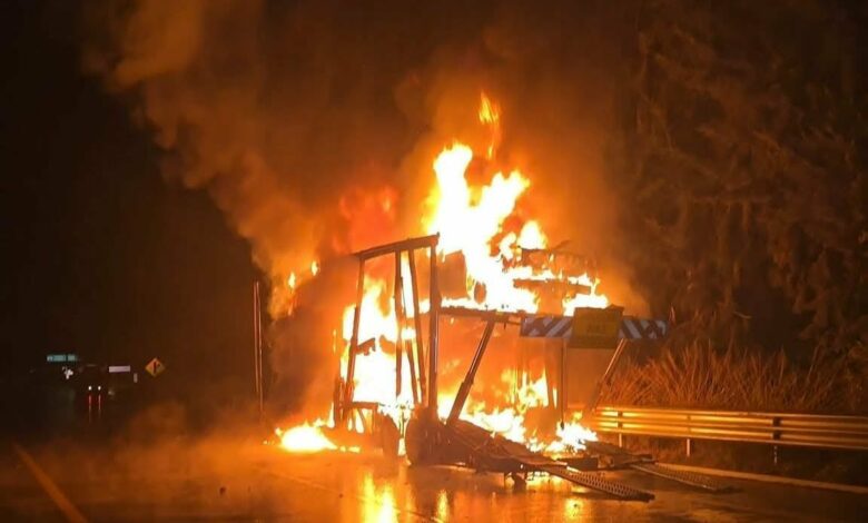 Ziracuaretiro, Mich.- 17 de enero de 2026.- Un tráiler tipo nodriza que transportaba vehículos nuevos se incendió por una aparente falla mecánica, cuando circulaba sobre la autopista Siglo XXI, en el tramo carretero Uruapan-Pátzcuaro.