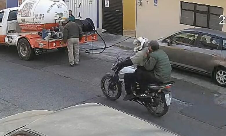 Morelia, Mich.- Jueves 05 de febrero de 2026.- Una cámara de videovigilancia captó el momento exacto cuando dos sujetos que viajaban a bordo de una motocicleta presuntamente asaltaron a un trabajador de la empresa gasera «ServiGas», delito registrado en la colonia moreliana Ventura Puente.