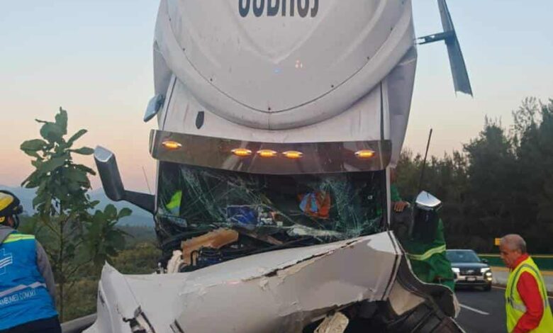 A su arribo los socorristas auxiliaron a José Luis M. A., de 55 años de edad, conductor de un tractocamión Freightliner de color blanco, con placas 33BH6J, mismo que estaba prensado en la cabina.