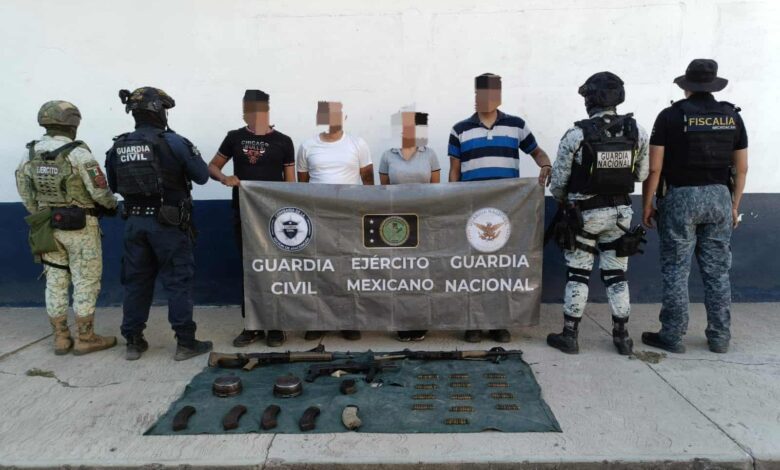 De inmediato se los uniformados repelieron, arribando al sitio personal de apoyo por tierra y aire, lo que permitió la detención de Kevin S., alias “El Búho” de 23 años de edad, Miguel Ángel A., “El Cucú”, de 18 años y Rafael U., de 17 años de edad, todo ellos originarios de Múgica, así como Mayra Betsaida C., de 31 años, esta última originaria de Uruapan.