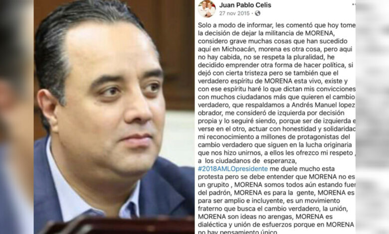 «Solo a modo de informar, les comento que hoy tome la decisión de dejar la militancia de MORENA, considero grave muchas cosas que han sucedido aquí en Michoacán, morena es otra cosa, pero aquí no hay cabida, no se respeta la pluralidad, he decidido emprender otra forma de hacer política, sí dejo con cierta tristeza pero sé también que el verdadero espíritu de MORENA está vivo, existe y con ese espíritu haré lo que dictan mis convicciones con muchos ciudadanos más que quieren el cambio verdadero, que respaldamos a Andrés Manuel López Obrador, me consideró de izquierda por decisión propia y lo seguiré siendo, porque ser de izquierda es verse en el otro, actuar con honestidad y solidaridad mi reconocimiento a millones de protagonistas del cambio verdadero que siguen en la lucha originaria que nos hizo unirnos, a ellos les ofrezco mi respeto, a los ciudadanos de esperanza, #2018AMLOpresidente, me duele mucho esta protesta pero se debe entender que MORENA no es un grupito, MORENA somos todos aún estando fuera del padrón, MORENA es para la gente, MORENA es para ser amplio e incluyente, es un movimiento fraterno que busca el cambio verdadero, la unión, MORENA son ideas no arengas, MORENA es dialéctica y unión de esfuerzos porque en MORENA no hay pensamiento único». Cita el texto que él mismo publicó el 27 de Noviembre de 2015.