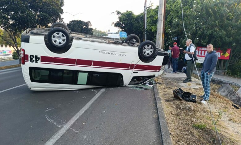 Morelia, Mich.- 21 de noviembre de 2025.- La mañana de este sábado, una combi de servicio público volcó al circular por el Libramiento de la ciudad de Morelia, resultando lesionados al menos 8 personas, que fueron atendidas por las corporaciones de auxilio.